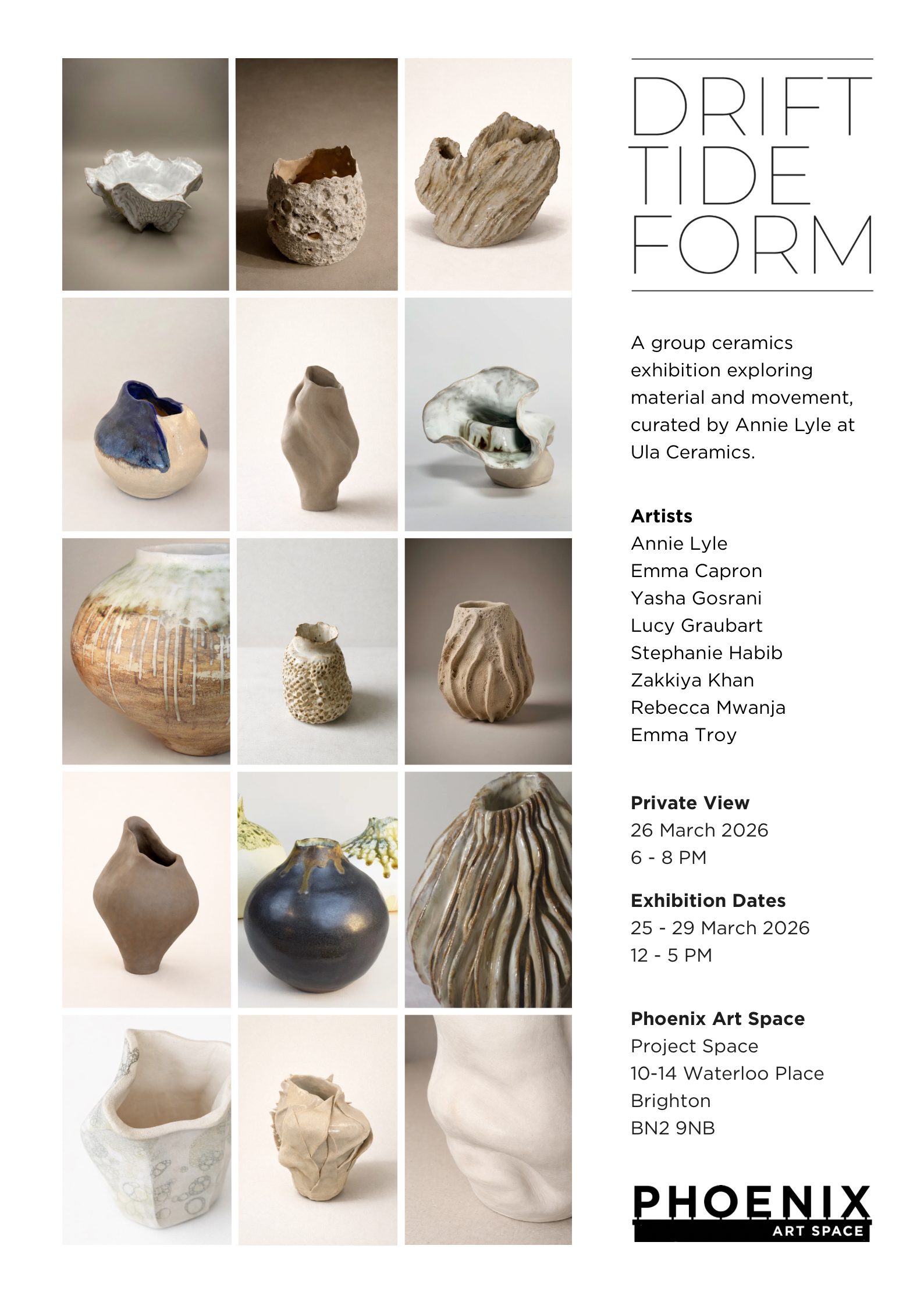 Drift Tide Form is a group exhibition bringing together ceramic artist and tutor Annie Lyle and a group of Brighton-based ceramicists connected through her studio practice at Ula Ceramics. Annie is proud to be exhibiting alongside artists she has taught and worked with over time, and this exhibition marks the first time the group is showing work together.