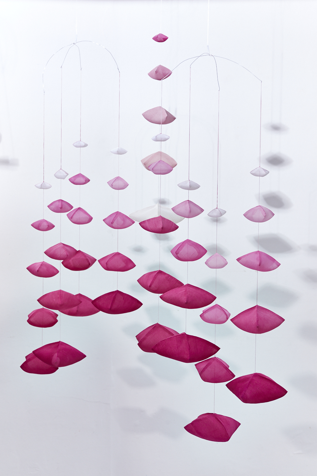 Created by artist, Sara Cook using traditional Korean silk organza and by more than 800 participants from the around the UK and from 20 other countries. Individuals registered to buy a kit of materials and then posted back the completed mobiles to her.